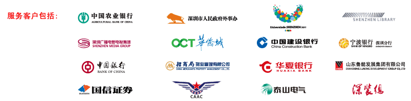 中国农业银行股份有限公司深圳市分行、深圳市人民政府外事办、深圳第26届世界大学生夏季运动会组委会、深圳图书馆、深圳广播电影电视集团、招商局物业管理有限公司、宁波银行深圳市分行、鲁能泰山电气有限公司、泰山电气设备有限公司、国信证券、中国民用航空深圳安全监督管理局、深圳市深装总装饰工程工业有限公司、意粉屋意大利餐厅、上井日本料理。。。。。